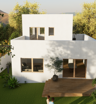 La vivienda tiene un programa para una familia mediana. En planta baja un pequeño hall te lleva al salón comedor cocina en open concept. Cuenta con un dormitorio principal en planta baja, además de un baño y el cuarto de instalaciones. La planta de arriba cuenta con un despacho, dos dormitorios con un baño y un dormitorio principal con vestidor y baño privado. Este dormitorio tiene acceso privado a una terraza descubierta. Se diseña desde el inicio para ser certificada por el Passivhaus Institut, por lo que se trata de una casa pasiva de muy bajo consumo energético. Los huecos de fachadas se optimizan para logra el máximo ahorro de energía y además disponen de elementos de protección solar de cara a limitar las ganancias de radiación solar en verano. Al tratarse de una vivienda passivhaus, se garantiza un elevado confort interior durante todo el año. La construcción es mixta con pilares metálicos y elementos horizontales, losa y forjados, de hormigón armado. Los cerramientos son de termoarcilla con un sistema de aislamiento térmico por el exterior, SATE, de 12 cm, sistema que conforma la envolvente térmica de la casa, completamente libre de puentes térmicos. Los huecos de la vivienda están dotados de acristalamientos triples con gas argón y carpinterías de PVC de alta calidad y prestaciones térmicas. Cubierta plana con 20cm de aislamiento. En cuanto a las instalaciones, esta vivienda cuenta con suelo radiante y refrescante. Además, dispone de renovación de aire interior de forma constante y controlada que se realiza mediante un equipo de ventilación mecánica y un recuperador de calor, gracias a los cuales la calidad del aire es óptima todo el año.