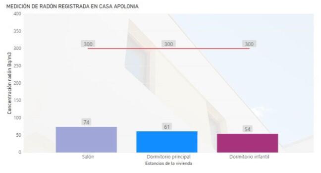 Los resultados obtenidos, menos de 100Bq/m3 no llegan a la tercera parte del límite marcado en el Código Técnico de la Edificación, 300 Bq/m3. Y se mantiene por debajo incluso del límite marcado por la OMS, 100 Bq/m³.